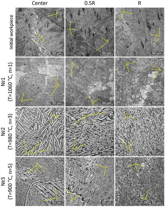 Figure 11 shows optical microstructure images of the initial workpiece and RSR deformed bars. The initial microstructure is characterized as lamellar type and contains coarse equiaxed β-phase grains with α-phase edgings. Inside the grains, variously oriented colonies are observed, consisting of α-phase plates formed as a result of polymorphic transformation during cooling from the β-region.