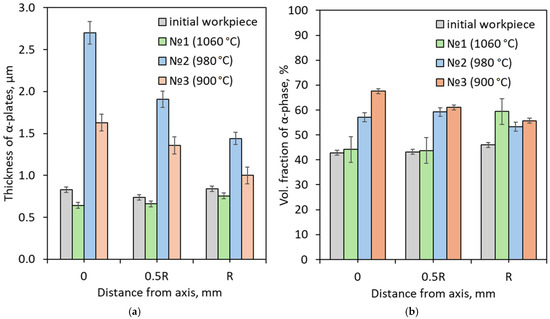 (a) Average α-phase plate thickness and (b) α-phase volume fraction of initial workpiece and RSR-processed bars.