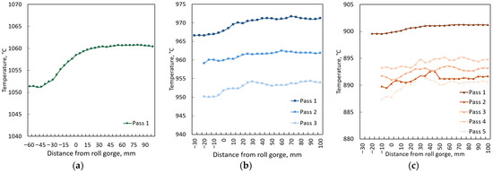 Change in central bar zone temperature in deformation zone: (a) Mode №1 (T = 1060 °C, n = 1); (b) Mode №2 (T = 980 °C, n = 3); (c) Mode №3 (T = 900 °C, n = 5).