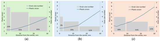 Distribution of plastic strain over bar cross-section after rolling and GSN area: (a) Mode 1 (T = 1060 °C, n = 1); (b) Mode 2 (T = 980 °C, n = 3); (c) Mode 3 (T = 900 °C, n = 5).