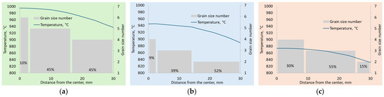 Distribution of temperature over bar cross-section after rolling and GSN area: (a) Mode 1 (T = 1060 °C, n = 1); (b) Mode 2 (T = 980 °C, n = 3); (c) Mode 3 (T = 900 °C, n = 5).