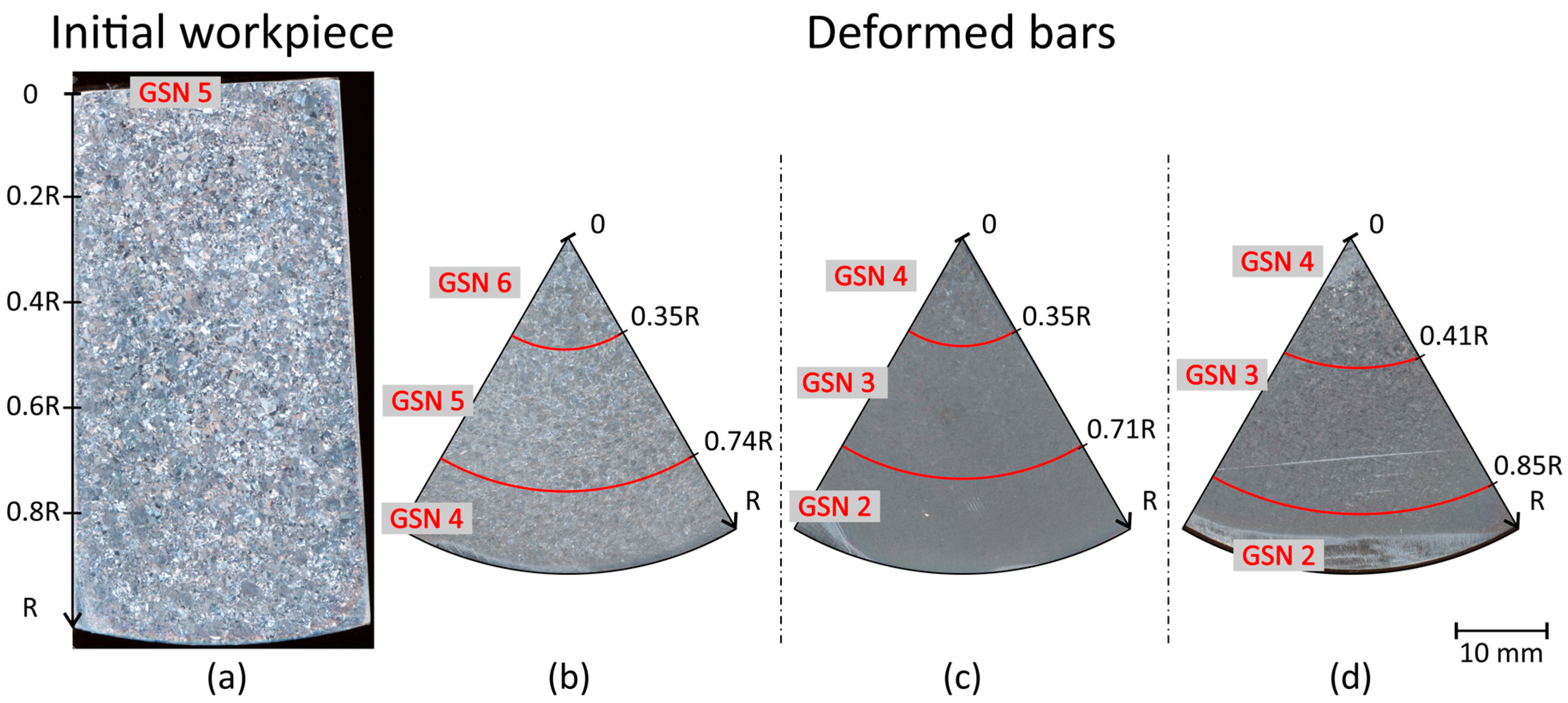 - New data on the correlation of deformation and thermal conditions of RSR and the structural parameters of the VT3-1 alloy (macrostructure grain size number distribution and α-phase) were obtained. High plastic strains combined with lower temperatures at the bar surfaces favor intense structure refinement. The data suggest that there is a minimum reduction of bar per pass and a total elongation ratio that are required for axial zone structure modification.