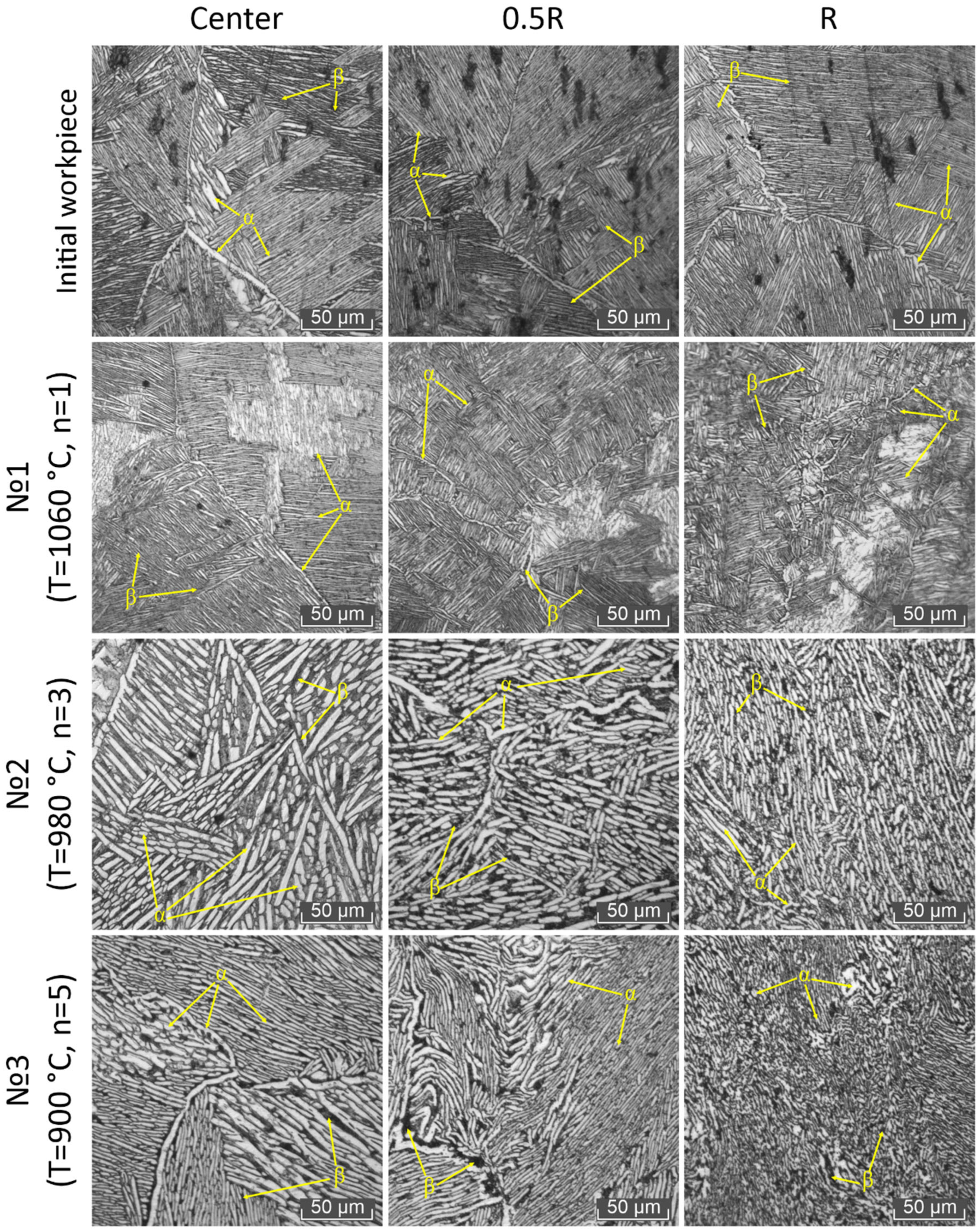 - The conditions required for the formation of macrostructures with the same GSN can vary significantly depending on the workpiece heating temperature before rolling and the number of rolling passes. RSR mode with average reduction per pass and workpiece heating to within the α + β region is optimal from the viewpoint of achieving a more profound structure modification.