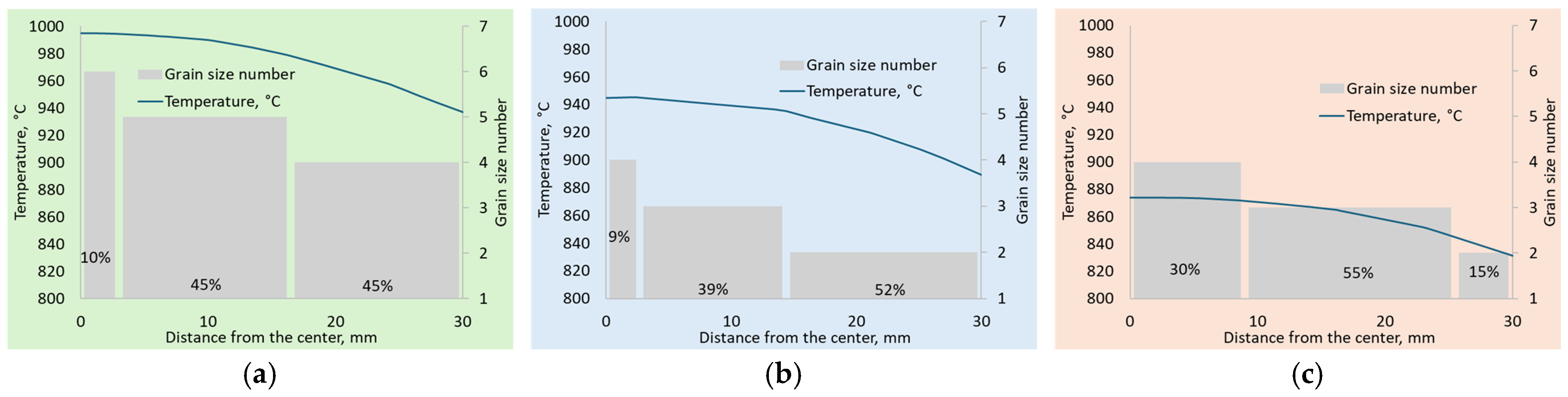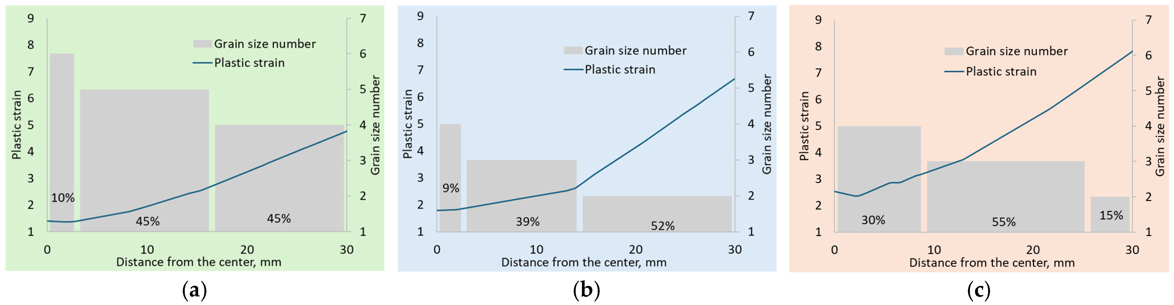 - Skripalenko, M.M.; Galkin, S.P.; Karpov, B.V.; Romantsev, B.A.; Kaputkina, L.M.; Danilin, A.V.; Skripalenko, M.N.; Patrin, P.V. Forming Features and Properties of Titanium Alloy Billets After Radial-Shear Rolling. Materials 2019, 12, 3179. [Google Scholar] [CrossRef] [PubMed]