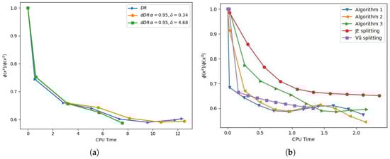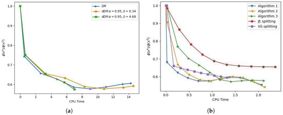 The corresponding numerical results were plotted in the figures (left) in Figure 2 and Figure 3, where “CPU Time” stands for the elapsed time using tic and toc in seconds. Notice that the figures (right) were taken from [7], in which “Algorithm 1”, “Algorithm 2” and “Algorithm 3” are those algorithms recently proposed in [7], “JE splitting” is a splitting method of (Algorithm 1 of [6]), and “Vũ splitting” is a splitting method proposed in [15].