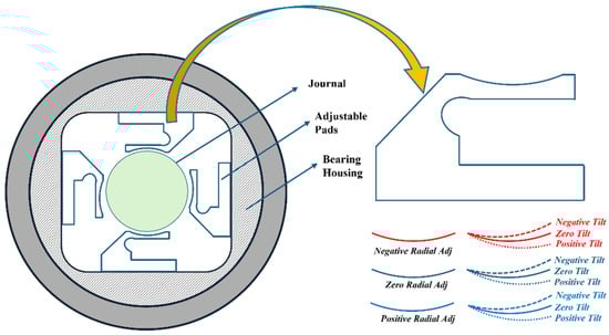 Chasalevris and Dohnal [22] proposed an adjustable journal bearing with a flexible mounting which can provide an additional film thickness layer through controlled adjustments of a semi-bearing part. Such adjustments were found to reduce resonant amplitudes by up to 70% as rotors operate at critical speeds. The adjustable bearing concept was further applied to partial arc bearings to extend stable operating margins to speeds well above the first critical speed. Such a geometry aids turbine operation by introducing parametric excitation of dynamic properties at specific frequencies, generating parametric antiresonance to eliminate instability [23,24]. The modified form of adjustable bearing presented in this study is based on the bearing designs detailed in Parkins and Martin [25]. Two different designs were developed, one with adjustable segments on the shaft and the other with an adjustable mechanism on the bearing’s inner part. Experimental tests were conducted on both semi-active bearing models to investigate variations in rotor positions [26,27]. Zhang et al. [28,29] developed a variable elliptical journal bearing with varying elliptical ratio to limit the vibration magnitudes of rotor under synchronous unbalanced loads at normal operating speeds. With an increased elliptical ratio, the bearing was found to reduce the forced vibration amplitude of a rigid rotor by up to 50% under heavy static loads and up to 60% under lighter static loads. Further developments of variable geometry bearings focused on adjusting the oil film’s stiffness and damping in response to rotor vibrations, making it more adaptable than fixed-pad bearings and enhancing machine stability and reliability under changing conditions. In such bearings, reducing the radial clearance to 70% provides effective lubrication for the upper bush, and decreasing it further to 30% increases the oil film pressure more than sixfold [30,31].