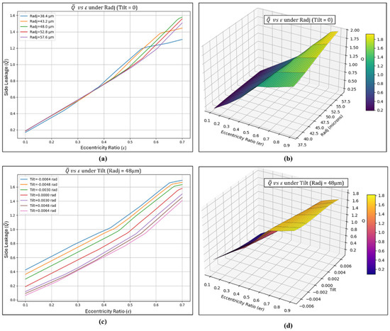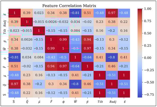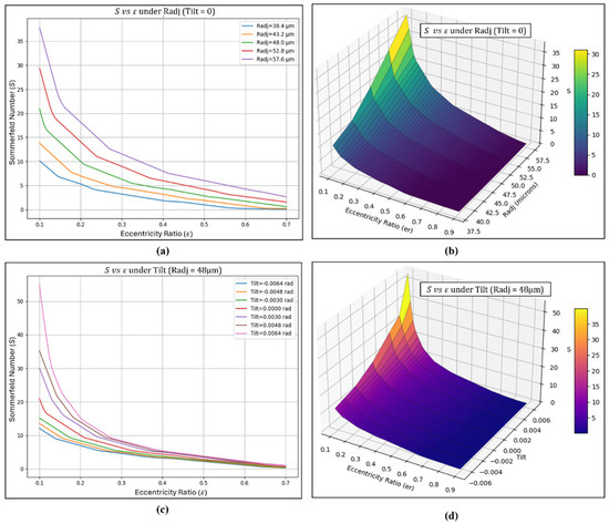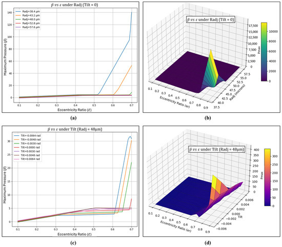 Figure 3 presents the correlation matrix illustrating the relationship between the steady-state characteristics of the adjustable bearing and the input parameters. The input variables considered were the eccentricity ratio (), radial adjustment (Radj), and tilt adjustment (Tilt). The output variables included maximum pressure (), dimensionless load capacity (), attitude angle (), friction force (), friction variable (), side leakage (), and the Sommerfeld number (S). From Figure 3, it can be observed that the eccentricity ratio shows a strong correlation with the side leakage, as it is directly affected by the rotor’s position. The other steady-state parameters are mainly influenced by the eccentricity ratio as well, but they exhibit lower correlation values since higher eccentricity generally reduces film pressure and load capacity. The radial and tilt pad adjustment factors exhibit moderate correlation with all output variables, as inward or outward adjustments can produce varying results and may positively or negatively influence the bearing’s performance characteristics. The generated film pressures were found to have a strong correlation with load capacity, as a thinner film typically produces higher pressures, and integrating these pressures determines the overall load-carrying capacity. The attitude angle typically exhibits a negative correlation with side leakage as higher attitude angle narrows the lubricant film clearance thereby restricting flow through the bearing.