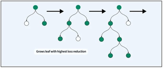 LightGBM is an efficient gradient boosting framework based on decision tree algorithms, specifically designed for faster training speed, lower memory usage, and improved accuracy. Unlike traditional gradient boosting methods that grow trees level-wise, LightGBM employs a leaf-wise tree growth strategy, which selects the leaf with the maximum loss reduction to grow next (refer Figure 6). This allows LightGBM to achieve deeper trees and better accuracy while maintaining computational efficiency. LightGBM introduces several enhancements over traditional boosting frameworks, such as histogram-based decision tree learning, gradient-based one-side sampling (GOSS), and exclusive feature bundling (EFB), making it particularly effective on structured datasets like the one used here. In this study, the following hyperparameters were included in the optimization search space [54].