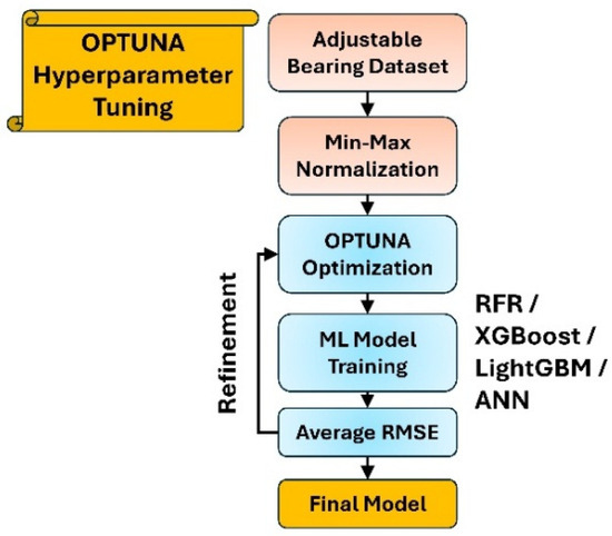 where is the number of cross-validation folds, and is the RMSE on the k-th fold for the model trained with hyperparameters . This approach allows Optuna to adaptively refine its sampling strategy based on past evaluations, thereby efficiently exploring the hyperparameter space. The complete workflow is summarized in Figure 8, which shows the progression from data normalization to model finalization via Optuna optimization.