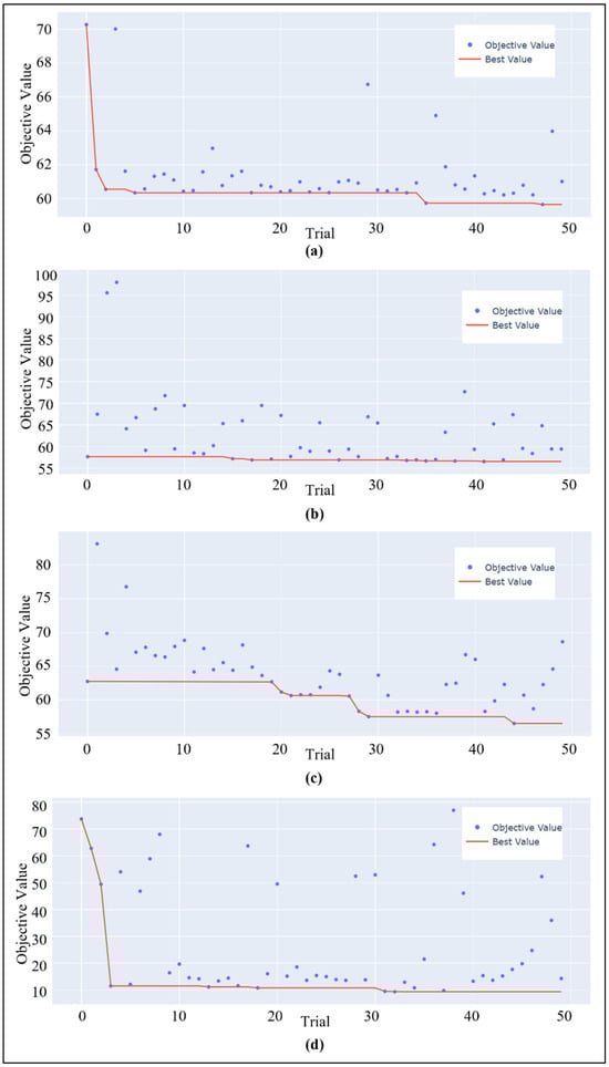 Optimization history plot of (a) RFR, (b) XGBoost, (c) LigthGBM, and (d) ANN model.