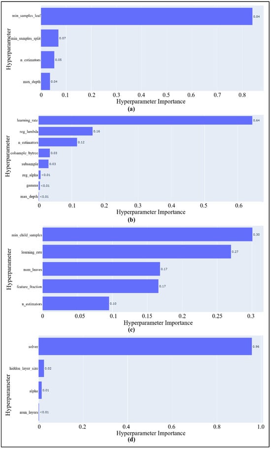 Hyperparameter importance scores for (a) RFR, (b) XGBoost, (c) LigthGBM, and (d) ANN model.