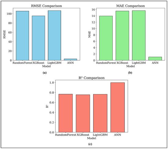 Performance metrics: (a) RMSE, (b) MAE, and (c) R2 of the ML models evaluated.