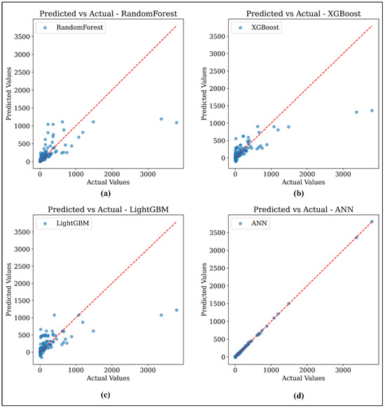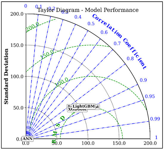 Figure 11 presents the comparative evaluation of the machine learning models using three standard regression metrics: RMSE, MAE, and R2. The ANN model is found to significantly outperform the ensemble methods, RFR, XGBoost, and LightGBM, achieving the lowest RMSE and MAE values, and the highest R2 score close to 1.0. To visualize model agreement and standard deviation, a Taylor diagram is plotted in Figure 12. The ANN model is positioned closest to the reference point, confirming its excellent correlation and low variance compared to the other models. LightGBM and XGBoost follow with relatively strong correlation values, while RFR shows slightly reduced performance.