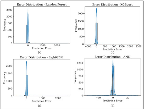 For every candidate configuration, the model was trained and evaluated using five-fold cross-validation, and the average Root Mean Squared Error (RMSE) across all folds was returned to the optimizer as the objective value. This process was repeated for 50 trials per model, during which Optuna adaptively updated its probabilistic model based on past evaluations. In the early trials, hyperparameters were sampled broadly to explore the search space (exploration), while later trials increasingly focused on refining configurations near the most promising candidates (exploitation). Convergence was reached when improvements in RMSE became marginal across consecutive trials, as observed in the optimization history plots (Figure 9). This iterative Bayesian approach allowed efficient navigation of the hyperparameter space and ensured that the final configurations reported in Table 2 represented near-optimal trade-offs between model complexity and prediction accuracy.