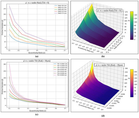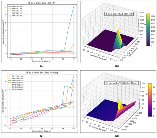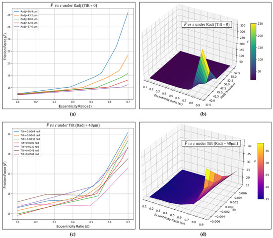 The steady-state characteristics of the multi-pad adjustable bearing shown in Figure 2 are derived from the iterative solution of the Reynolds equation with simultaneous convergence of pressure and attitude angle. Using the Gauss–Seidel SOR scheme, the pressure distribution over the discretized grid is obtained, from which the film thickness for different pad adjustments is established. The resulting non-dimensional pressure field is integrated to determine the load-carrying capacity, while the corresponding frictional forces on the bearing surface are evaluated to characterize the operating performance of the adjustable bearing. Detailed methodology and governing equations related to the computation of friction forces and other steady-state characteristics have already been presented in the published work of Hariharan and Pai [48]. The total friction force is obtained by integrating the shear stress distribution over the bearing surface, accounting for contributions from both the pressure gradient and viscous shear components. For numerical convenience and generalization, the friction force is expressed in a non-dimensional form. The corresponding dimensionless friction variable is subsequently derived by normalizing the friction force with the applied load.