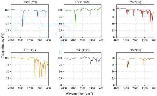 Figure 1 displays randomly selected FTIR spectra (one per polymer class) drawn from the full dataset. These examples illustrate two common characteristics of the unprocessed spectra: the presence of high-frequency noise and a continuous, non-uniform background (baseline drift). While no quantitative analysis is derived from this figure, it serves a descriptive purpose: to contextualize the nature of the input data and to motivate the need for preprocessing, specifically baseline correction and noise reduction, prior to machine learning classification. This visual overview is intentionally placed here to help readers understand the starting conditions of the spectral data before any transformation is applied.