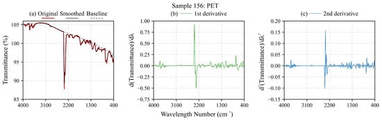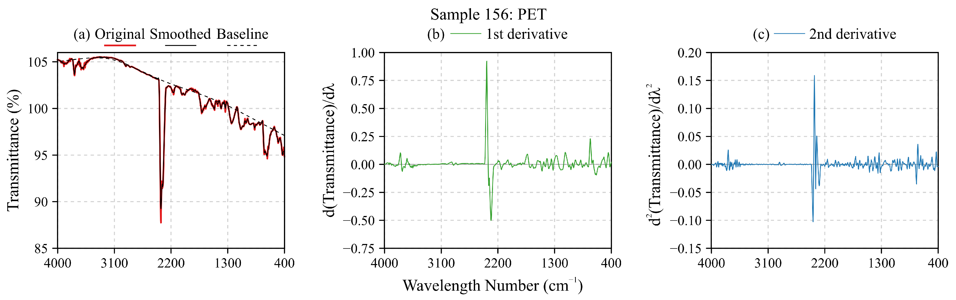 Spectral derivatives improve the ability to distinguish narrow peaks and subtle spectral features by reducing baseline effects, which is a key benefit when differentiating polymers with similar absorption profiles. However, direct numerical differentiation often amplifies high-frequency noise. To address this, we used the Savitzky–Golay filter, which calculates derivatives through local least-squares polynomial regression over a sliding window, providing smoothed derivative estimates that maintain peak shape and relative intensity [