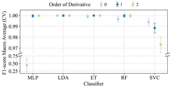Table 3, allowing for the identification of performance trends and model stability. The results clearly show that the MLP classifier’s performance is highly dependent on derivative preprocessing. It performed poorly on the original spectrum (mean F1 ≈ 0.445) but achieved near-perfect scores (F1 > 0.995) with substantially lower variability after the application of first or second derivatives. Conversely, the LDA, ET, and RF classifiers consistently demonstrated an exceptional and stable performance (mean F1 ≈ 1.0) regardless of the derivative order. The SVC model, while also performing well, showed more sensitivity, achieving its best result (F1 > 0.99) on the raw spectrum and exhibiting a slight performance decay and increased variance with derived data.