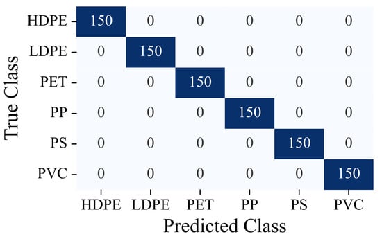Figure 5. The matrix presents a perfect diagonal, where 100% of the samples from each polymer class were correctly classified, without any instance of misclassification among the six categories (HDPE, LDPE, PET, PP, PS, and PVC). Each cell outside the main diagonal has a value of 0, indicating the total absence of false positives or false negatives.