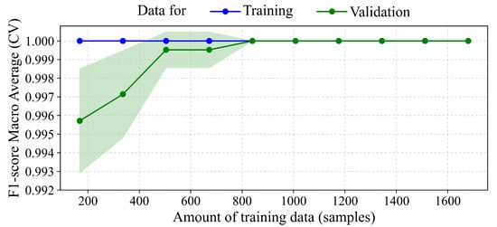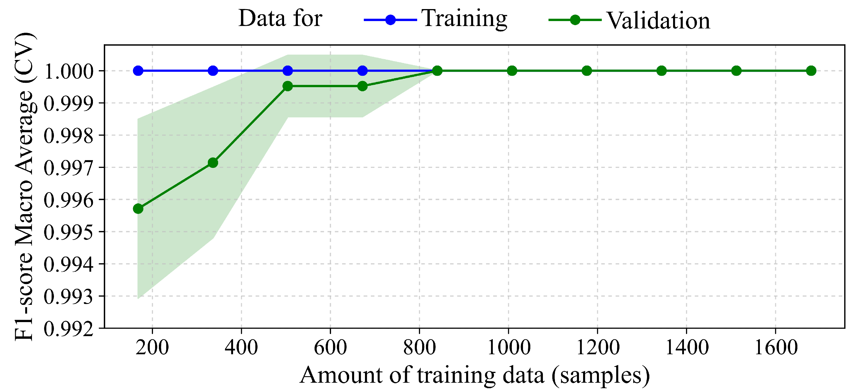 Figure 6. The X-axis represents the amount of training data (from ∼150 to 1680 samples), while the Y-axis shows the average macro F1-score. The training curve (blue) remains at 1.0 across all training sizes, while the validation curve (green) increases steadily until it converges with the training curve around 800–840 samples. From that point onward, both curves plateau at 1.0, and the confidence interval around the validation scores narrows significantly. This indicates that the model has reached a stable generalization performance.