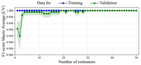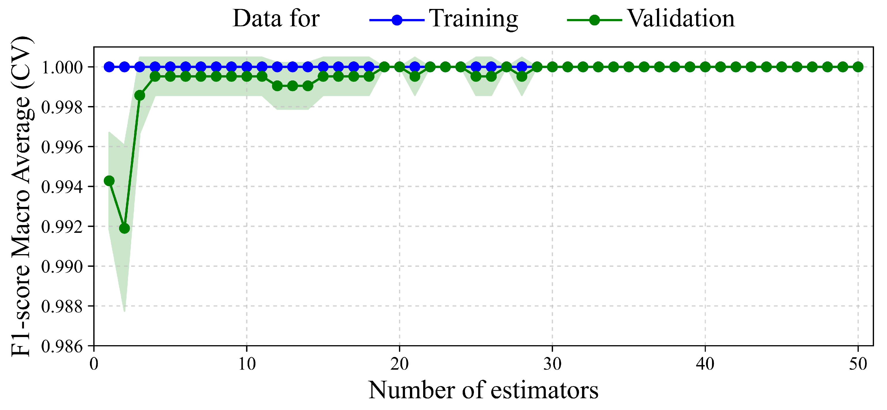 Figure 7 shows the effect of varying the number of estimators (n_estimators) on the performance of the ET classifier, where each estimator corresponds to a randomly constructed decision tree. The training F1-score (blue) remains constant at 1.0 across all values. In contrast, the validation F1-score (green) rises sharply from 1 to 4 estimators, stabilizing around 0.999 to 1.0 from 29 estimators onward. Beyond 19 estimators, the validation performance becomes flat and stable, with minimal variance across folds, as shown by the narrow green confidence band. The model reaches maximum generalization with 19 estimators and remains stable beyond 30.