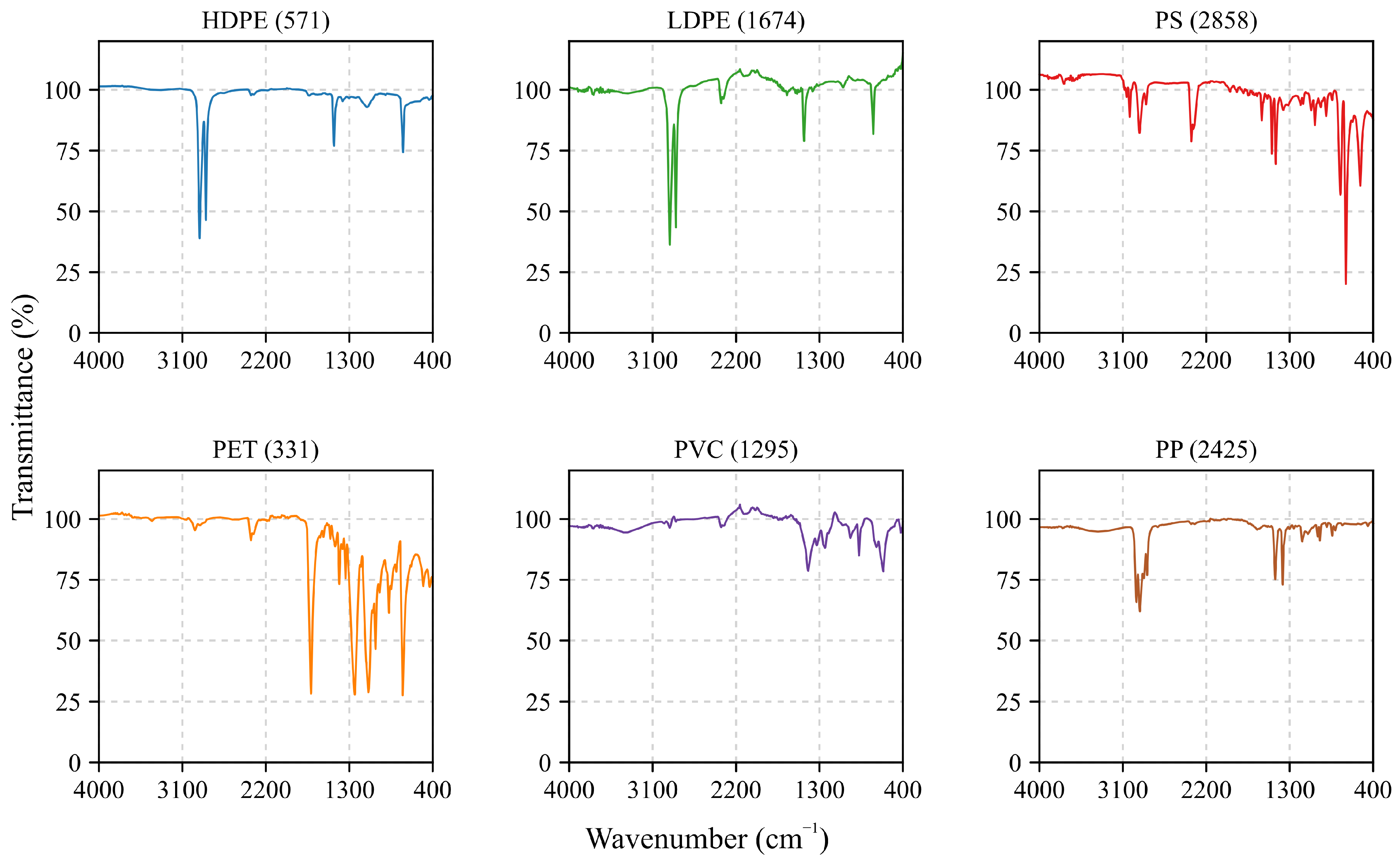 Our approach distinguishes itself and complements existing work in several ways. First, we use a public dataset of FTIR spectra from six common industrial polymers (PET, HDPE, PVC, LDPE, PP, and PS), with 500 samples for each [