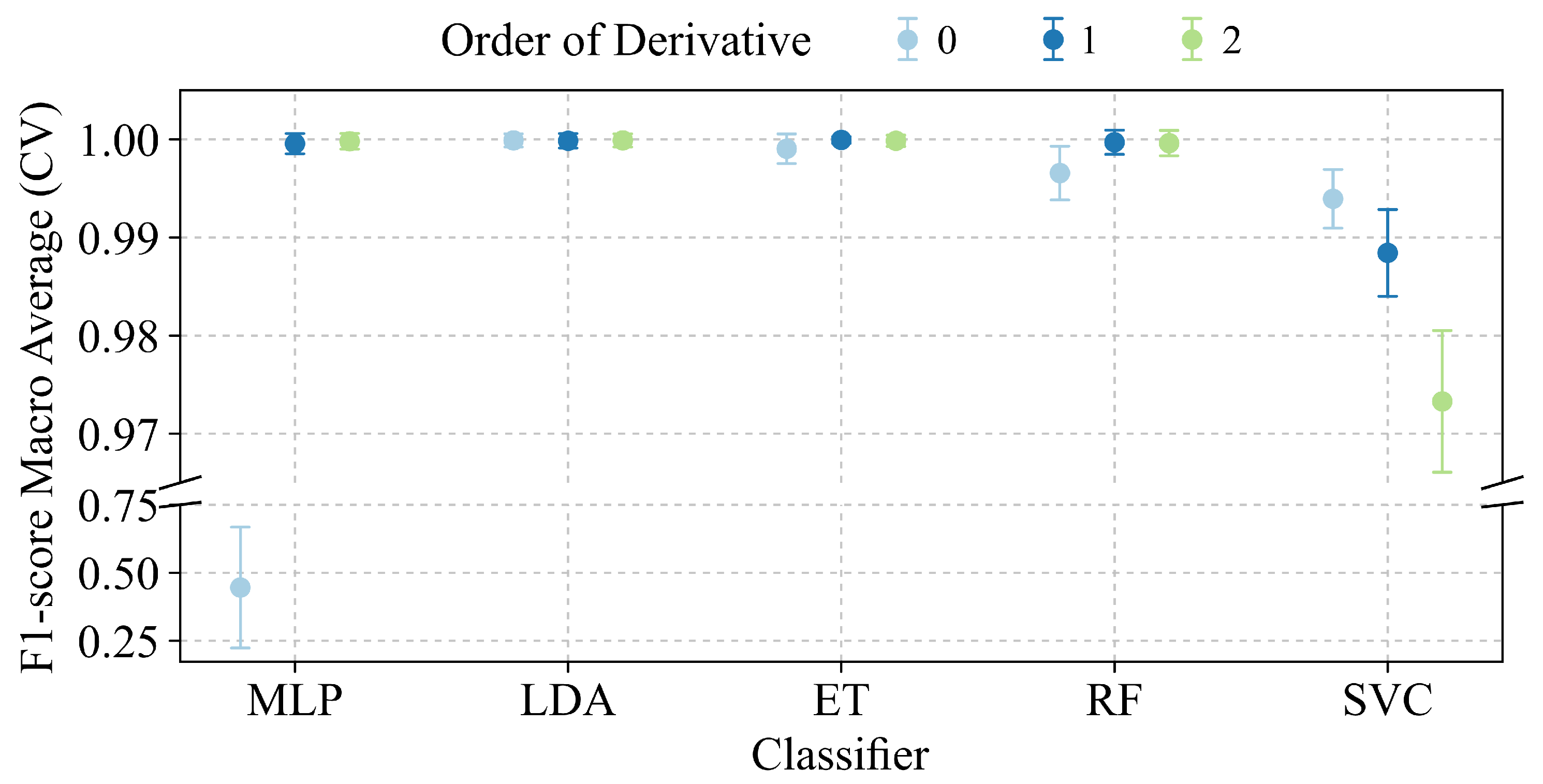 Figure 3), the trade-off between accuracy and efficiency can be evaluated. For example, ET with the first derivative was not only the model with the highest and most stable F1, but also one of the fastest to train. LDA, though slightly slower than ET, offers a near-perfect performance with very reasonable efficiency. While MLP achieves an excellent performance with derivatives 1 and 2, its higher computational cost could be a consideration in applications with large data volumes or time constraints.