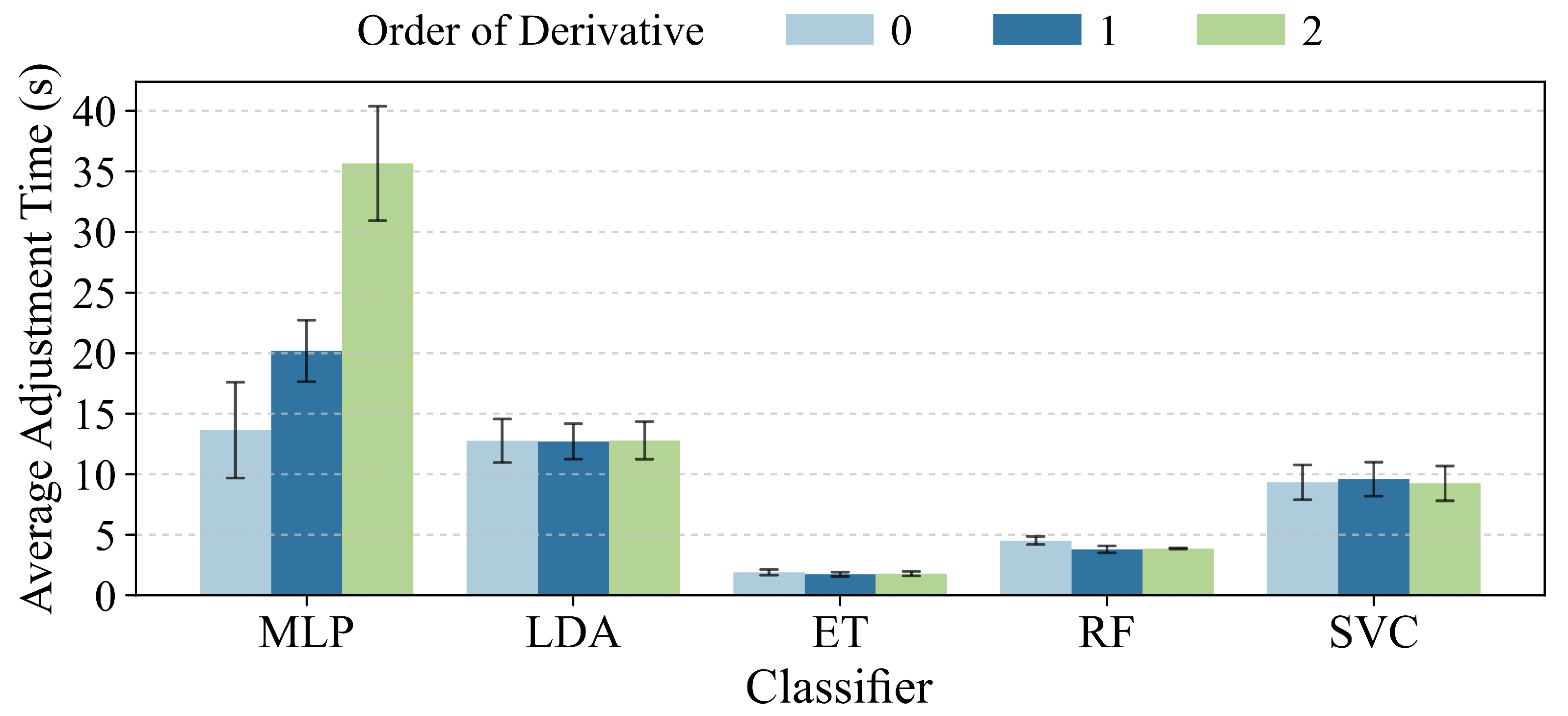 Figure 4, ET and RF classifiers stand out as the fastest to train, with consistently low average fit times (generally below 5 s) for all three derivative orders. LDA also shows notable computational efficiency, with fit times slightly higher than tree-based models, but still very competitive (around 11–15 s). Applying derivatives does not seem to significantly impact the fit time of these three types of classifiers.