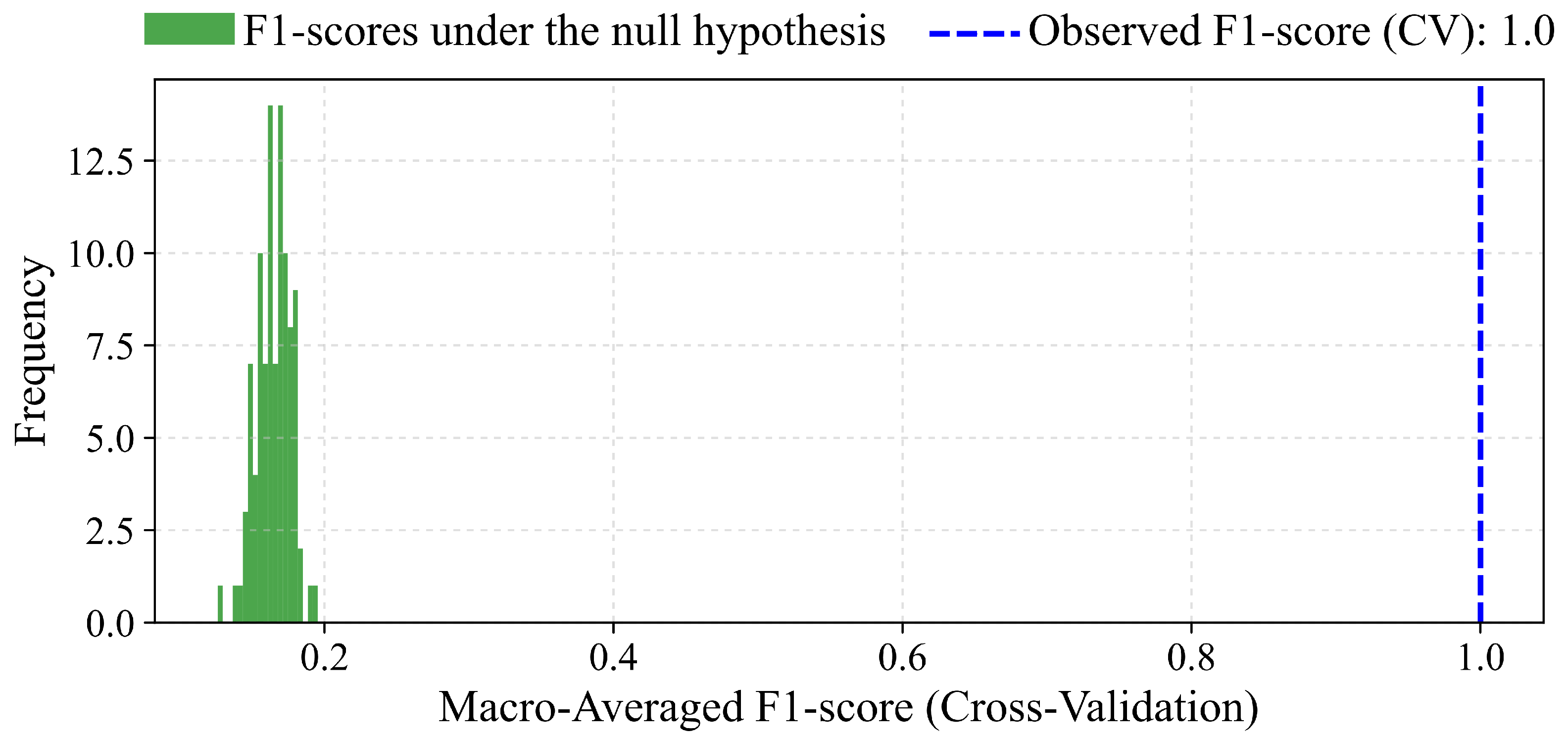 ), which states that the features and labels are statistically independent and that model performance arises by chance, was tested using 100 random label permutations, each followed by 5-fold cross-validation. The resulting F1-scores under random label assignments fell within a narrow and low range (approximately 0.15–0.25), as expected when no true relationship exists. In contrast, the observed F1-score with the true labels was 1.0, a clear outlier with respect to these randomized outcomes. The associated