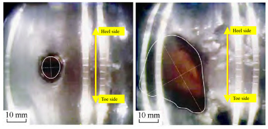 - During fracturing, the flow cross-section suddenly shrinks at the entrance of the perforation hole, which contributes to an increase in the fracturing fluid’s velocity up to 323.0 m/s at the hole entrance. This acceleration causes the most severe erosion, with a maximum erosion rate of 2.26 × 10−5 kg/(m2·s). The numerical simulation results are consistent with field fracturing tests, showing wall thinning and diameter enlargement at the perforation entrance.