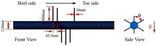 The constructed models included both fluid and structural domains. The Φ139.7 × 10.54 mm TP140V casing for filed application was selected to establish the fluid dynamic model (shown in Figure 2). The total length of the calculated domain was 3.5 m, with the perforated section being 1.5 m long. The perforation density was 16 holes per meter, and perforation was conducted at a 60° angle, creating a branch of holes 10 mm in diameter. To ensure the full development of the flow, flow stabilization zones, with a length of 1 m, were set up both upstream and downstream of the perforation cluster, in order to effectively eliminate boundary effects. The geometric parameters strictly correspond to the actual working conditions: the inner diameter of the casing was 118.62 mm, and the perforation depth was 800 mm.