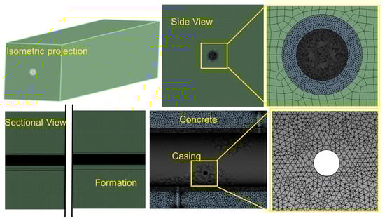 Schematic diagram of formation–cement–casing assembly and mesh generation.