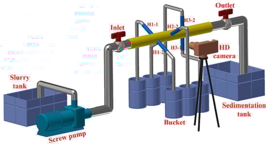 In order to validate the model’s reliability, physical data from the water–sand flow experiment by Qu et al. [27] were selected for comparison (the experimental device is shown in Figure 4). The experimental conditions were as follows: (1) the flow medium was clear water, the fluid velocity was 2.7 m/s, and the viscosity was 0.001 Pa·s; (2) the sand concentration was 2% and the sand particle diameter was 0.633 mm; and (3) the pipe diameter was 50 mm and the pipes were uniformly arranged with 6 × Φ12 mm holes, a 60° phase angle, and a hole spacing of 60 mm.