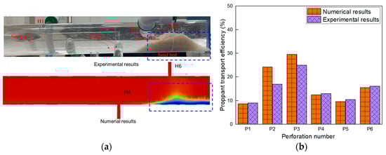 Comparison of numerical results with experimental results from Qu et al. [28]: (a) comparison of proppant transport; (b) comparison of proppant transport efficiency.