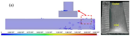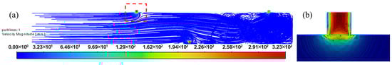 Fluid velocity contour near perforation holes: (a) velocity streak, (b) velocity contour (Zoomed-in view of the red box in Figure 6a).