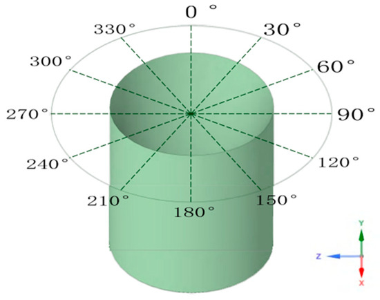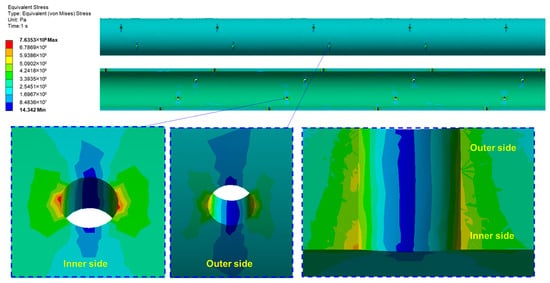 The Von Mises yield criterion states that under certain deformation conditions, a point in a material begins to enter the plastic state when the equivalent stress at that point reaches a specific value. This stress comprehensively considers the three principal stresses of the material, enabling it to quickly and accurately reflect the material’s stress state. It is generally used to evaluate fatigue and failure. The von Mises stress distribution of the casing under fracturing-fluid action is shown in Figure 8. It can be seen that the stress is relatively uniform along the casing axis, but stress concentration occurs at the perforation holes (according to the outside of the casing, in the directions of 90° and 270°, as shown in Figure 8 and Figure 9). Meanwhile, along the direction of the wall thickness, the stress of the inner wall is significantly higher than that of the outer wall, and the stress amplitude is gradually reduced along the hole axis.