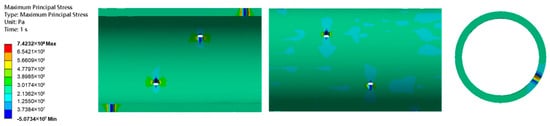 As shown in Figure 11, significant principal stress concentration occurs at the 90° and 270° azimuths relative to the perforation axis on the casing inner-wall region. The spatial distribution pattern of the principal stress is highly consistent with that of the equivalent stress. The inner wall of the perforation is in a combined tensile–compressive stress state, while non-perforated regions are under pure tensile stress. The maximum tensile stress in the casing is 742.32 MPa, less than the material tensile strength of 1050.00 MPa. The maximum compressive stress is 50.73 MPa (here, we define the principal stress in tension as positive and the principal stress in compression as negative), less than the material compressive strength of 862.00 MPa. These results confirm that tensile/compressive failure does not occur in the casing under the current operating conditions.