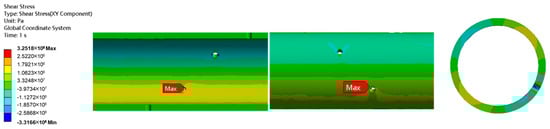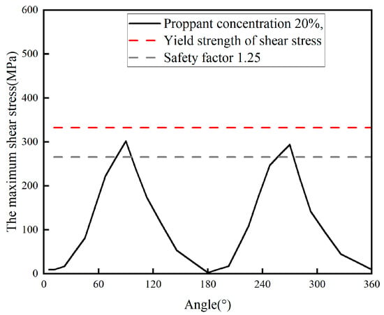 Figure 12 and Figure 13 show the contour plot of shear stress distribution and the shear stress distribution curve at the perforation under erosion, respectively. It can be seen that shear stress concentration occurs near the perforations, with the maximum shear stress (325.18 MPa) located at the perforation hole. Considering that the shear strength of TP140V casing is 332.17 MPa and the safety factor is 1.25, the allowable shear stress is 265.74 MPa. This means the shear stress experienced by the casing exceeds the allowable shear stress. Therefore, shear stress failure will occur in the casing under the current operating conditions.