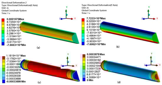 Casing displacement contour: deformation in the (a) x-, (b) y-, and (c) z-directions, and (d) the total deformation.