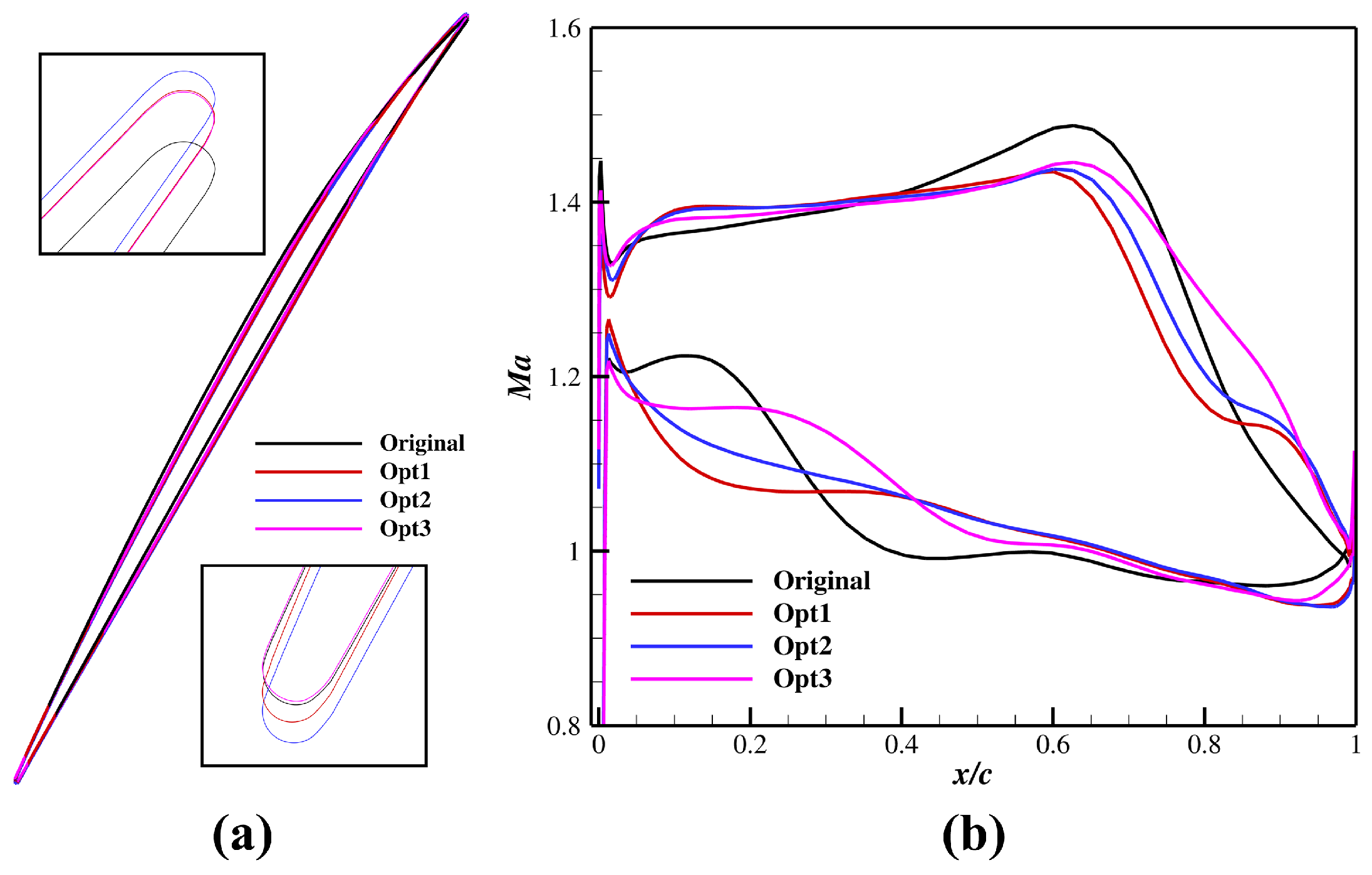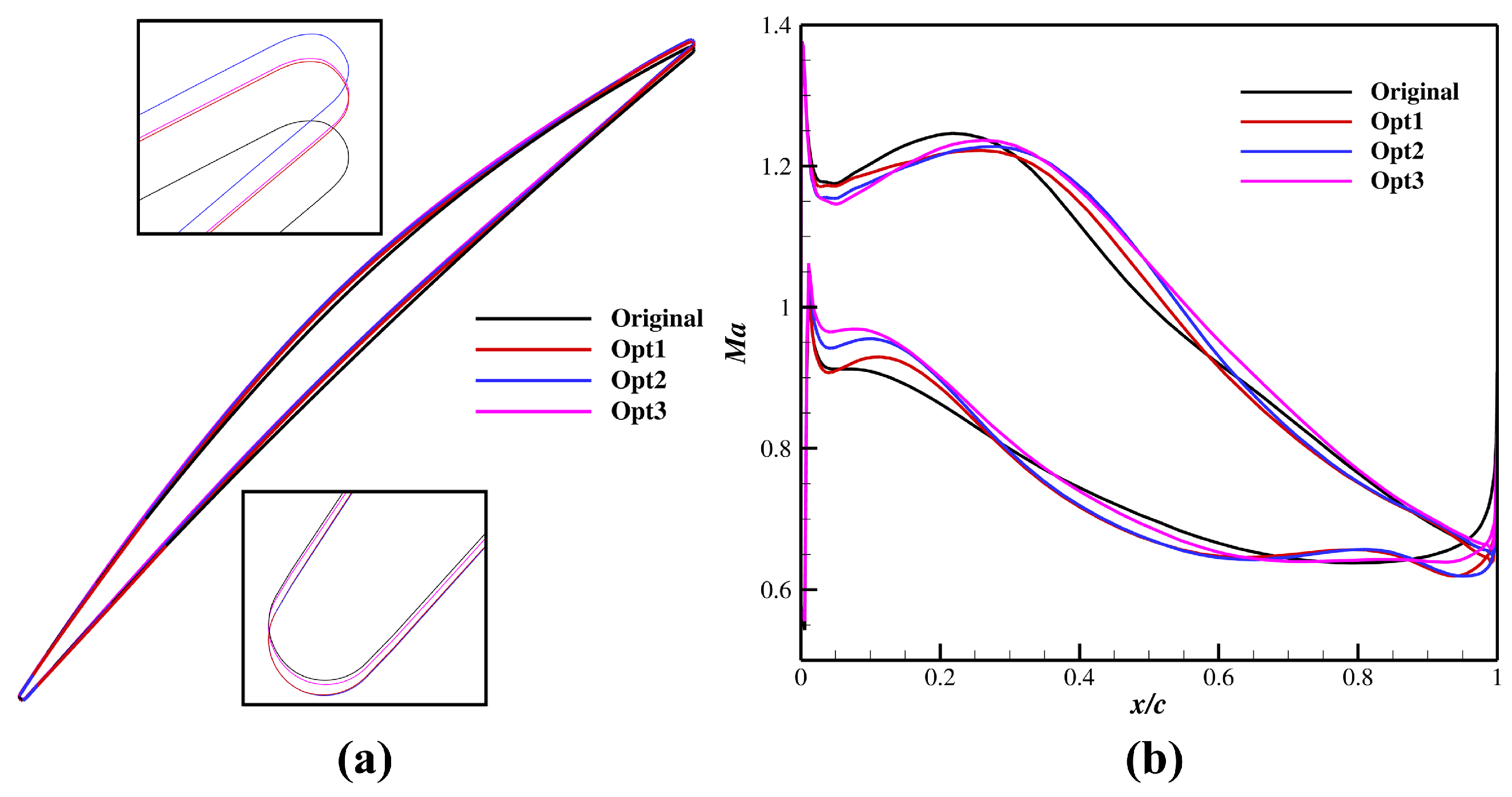 - Li, J.; Luo, J.; Liu, F.; Zheng, Y.; Han, Z. Performance sensitivity analysis and aerodynamic optimization of compressor cascades by a turbulence adjoint method. AIP Adv. 2024, 14, 115307. [Google Scholar] [CrossRef]