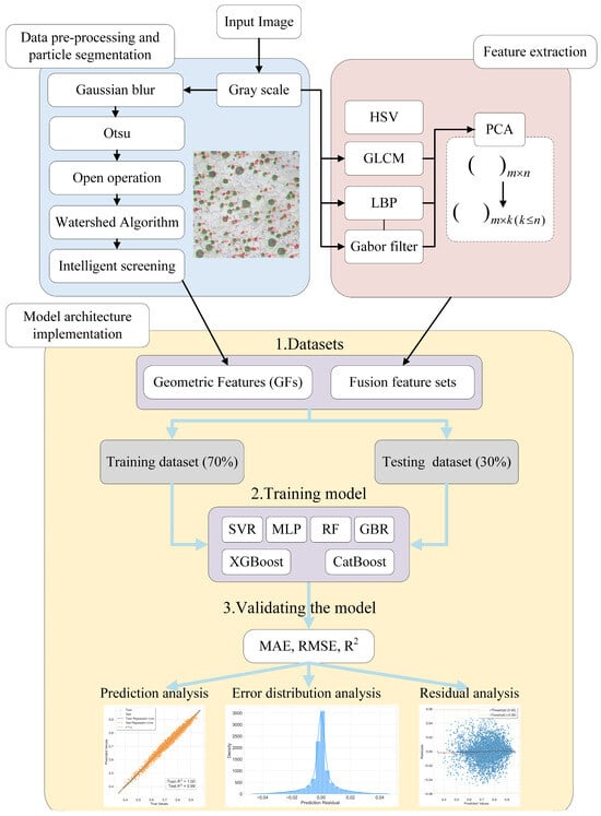 Our methodology is divided into three core stages. The first stage focuses on image preprocessing and particle segmentation: grayscale conversion, Gaussian filtering for noise reduction, and adaptive thresholding via Otsu’s method are applied to create a binarized image. Morphological opening operations are used to remove minor noise artifacts, and a watershed algorithm based on distance transformation addresses particle adhesion. An intelligent filtering mechanism is also integrated to exclude edge-cut particles, effectively accounting for the dense distribution commonly seen in ductile iron images. The second stage involves feature extraction. Through contour analysis, nine types of GFs are extracted, such as Feret diameter and particle count, with some computed via convex hull methods. To deepen feature representation, HSV color space transformation is used to quantify chromatic attributes of graphite particles. Additionally, GLCM is used to capture texture uniformity, LBP to describe local contrast in micro-textures, and multi-scale Gabor filters to extract orientation-sensitive frequency features. These features effectively represent interfacial properties between graphite and the metallic matrix. To mitigate the high dimensionality of the fused feature set, PCA is employed for dimensionality reduction. The third stage entails model development and evaluation. The dimension-reduced feature vectors are used as inputs to six regression models to learn nonlinear mappings to geometric features. A 10-fold cross-validation strategy is applied during training, with the dataset split into training and test sets. Estimation accuracy is assessed through quantitative metrics and regression plots comparing estimated and actual values to validate model generalizability. Ultimately, a structure estimation model based on multi-source feature fusion is established. The overall architecture of the GFs fusion estimation model is illustrated in Figure 1.