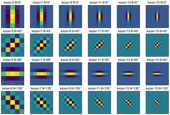 Finally, Gabor filters were applied at four orientations and six scales to capture multi-scale spatial-frequency information. For each filter response, five representative statistical descriptors—mean, variance, standard deviation, energy, and entropy—were computed, producing a 120-dimensional feature set per image. PCA was further employed to reduce redundancy and mitigate the risk of overfitting. As shown in Figure 2, Gabor filters are illustrated at multiple orientations and scales to represent different texture characteristics.