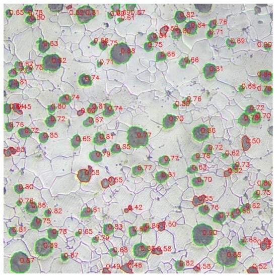 In the Graphite Particle Extraction results, particles that are overall cut off by the boundary are excluded, and the geometric information of the remaining valid particles is extracted. Feature parameters for each particle are then calculated. After extracting the particle features, particles are classified as qualified or not based on a roundness threshold of 0.6. Particles meeting the criteria are included in the qualified particle pool, and the average values of each feature are obtained for subsequent statistical analysis, such as total particle count, qualified particle count, graphite nodularity, average area, average Feret diameter, average roundness, average short-to-long axis ratio, average perimeter, and average nearest centroid distance—nine feature parameters in total. The segmentation results are shown in Figure 4, where the numbers represent the roundness of individual particles. The description of the extracted geometric feature dataset is presented in Table 1.