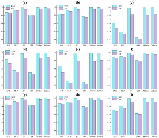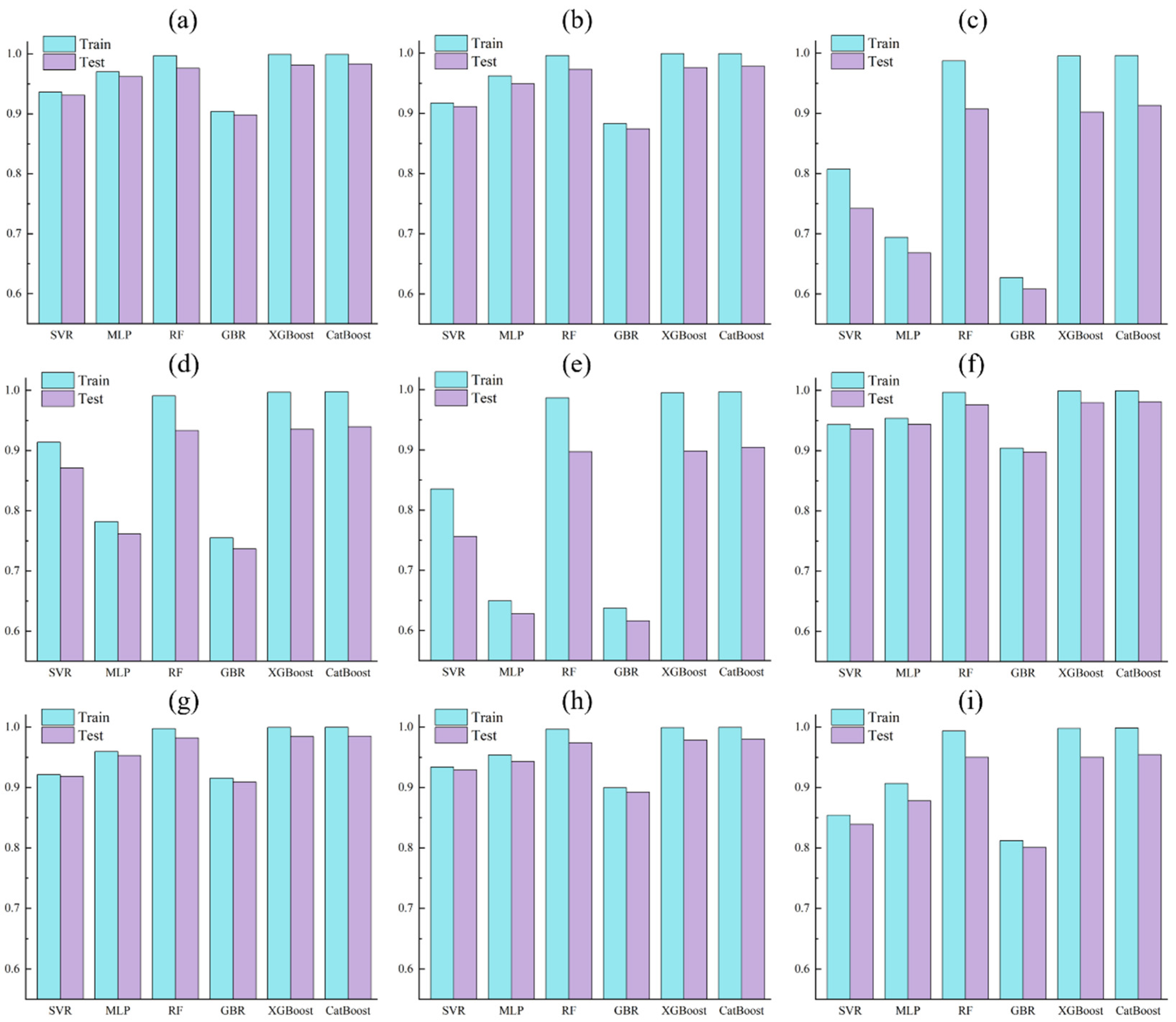 R2 values of each feature under different models: (a) total_particles; (b) qualified_particles; (c) graphite_nodularity; (d) avg_roundness; (e) avg_ratio; (f) avg_feret; (g) avg_area; (h) avg_perimeter; (i) avg_distance.