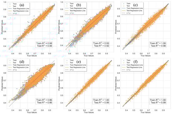 Estimation results of graphite_nodularity on different models. (a) GFs-SVR; (b) GFs-MLP; (c) GFs-RF; (d) GFs-GBR; (e) GFs-XGBoost; (f) GFs-CatBoost.