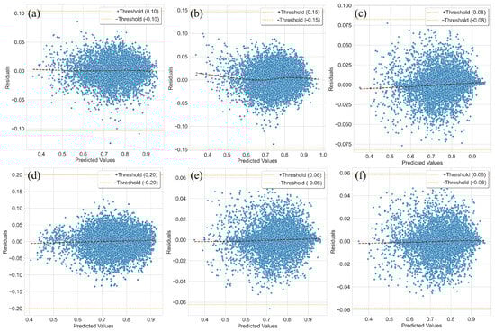 Residual analysis of GFs fusion feature datasets on different models. (a) GFs-SVR; (b) GFs-MLP; (c) GFs-RF; (d) GFs-GBR; (e) GFs-XGBoost; (f) GFs-CatBoost.