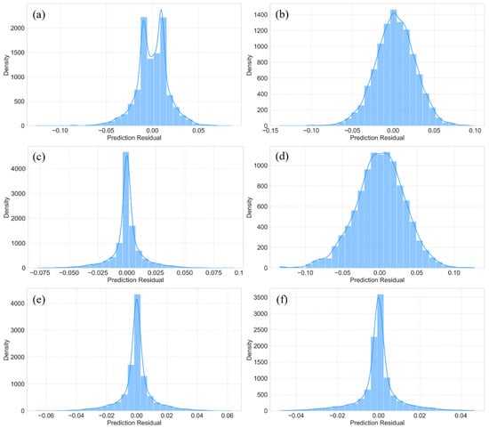 Histograms of the estimated residual distribution of GFs fusion feature datasets on different models. (a) GFs-SVR; (b) GFs-MLP; (c) GFs-RF; (d) GFs-GBR; (e) GFs-XGBoost; (f) GFs-CatBoost.