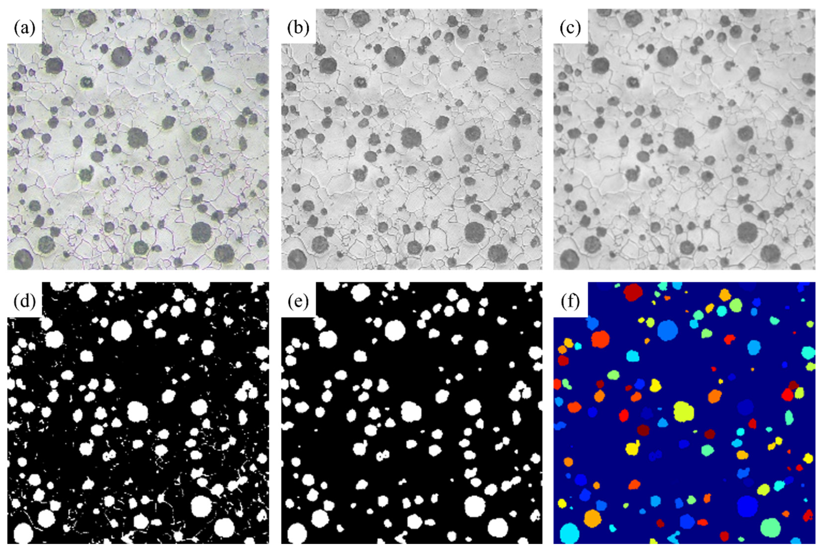 The original metallographic images were first converted to grayscale and smoothed using a Gaussian filter to reduce imaging noise. Adaptive thresholding based on Otsu’s method was then applied to obtain a binary image, followed by morphological opening to remove small noise and voids. Distance transform was performed on the binary image, and local maxima were detected. Marker-based watershed segmentation was subsequently applied to separate individual particles and extract their contours.