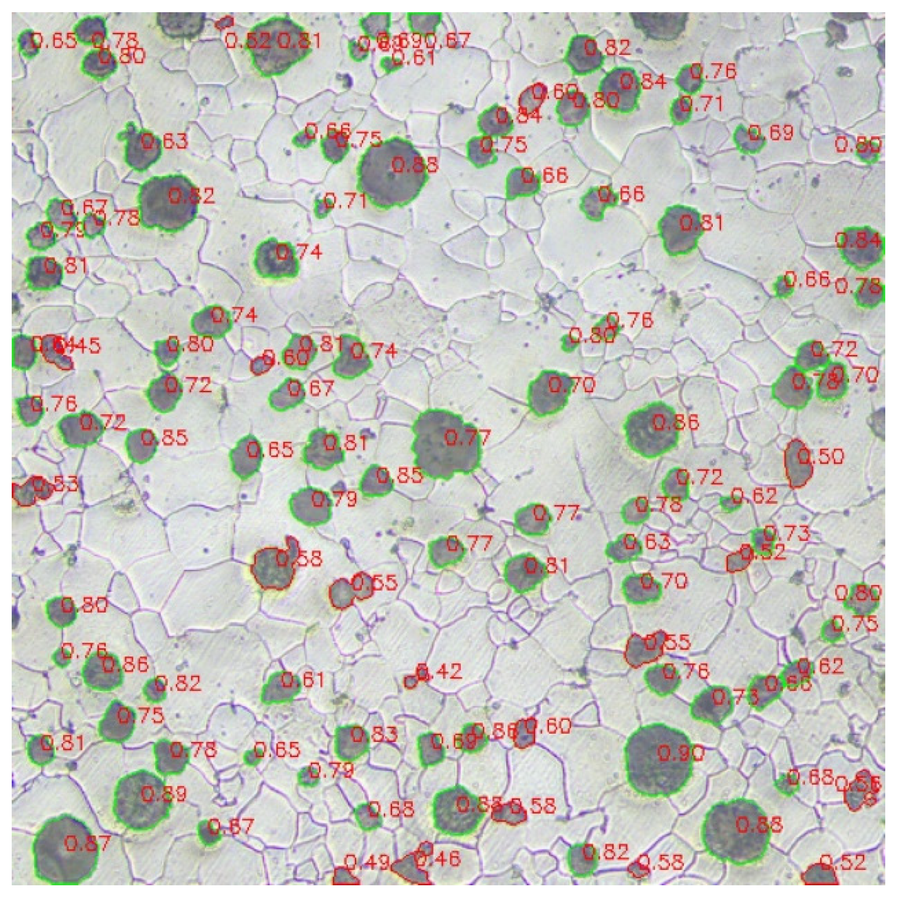 Analysis results of graphite particle roundness in ductile iron: particles with green contours have a roundness greater than 0.6, while those with red contours have a roundness less than 0.6.