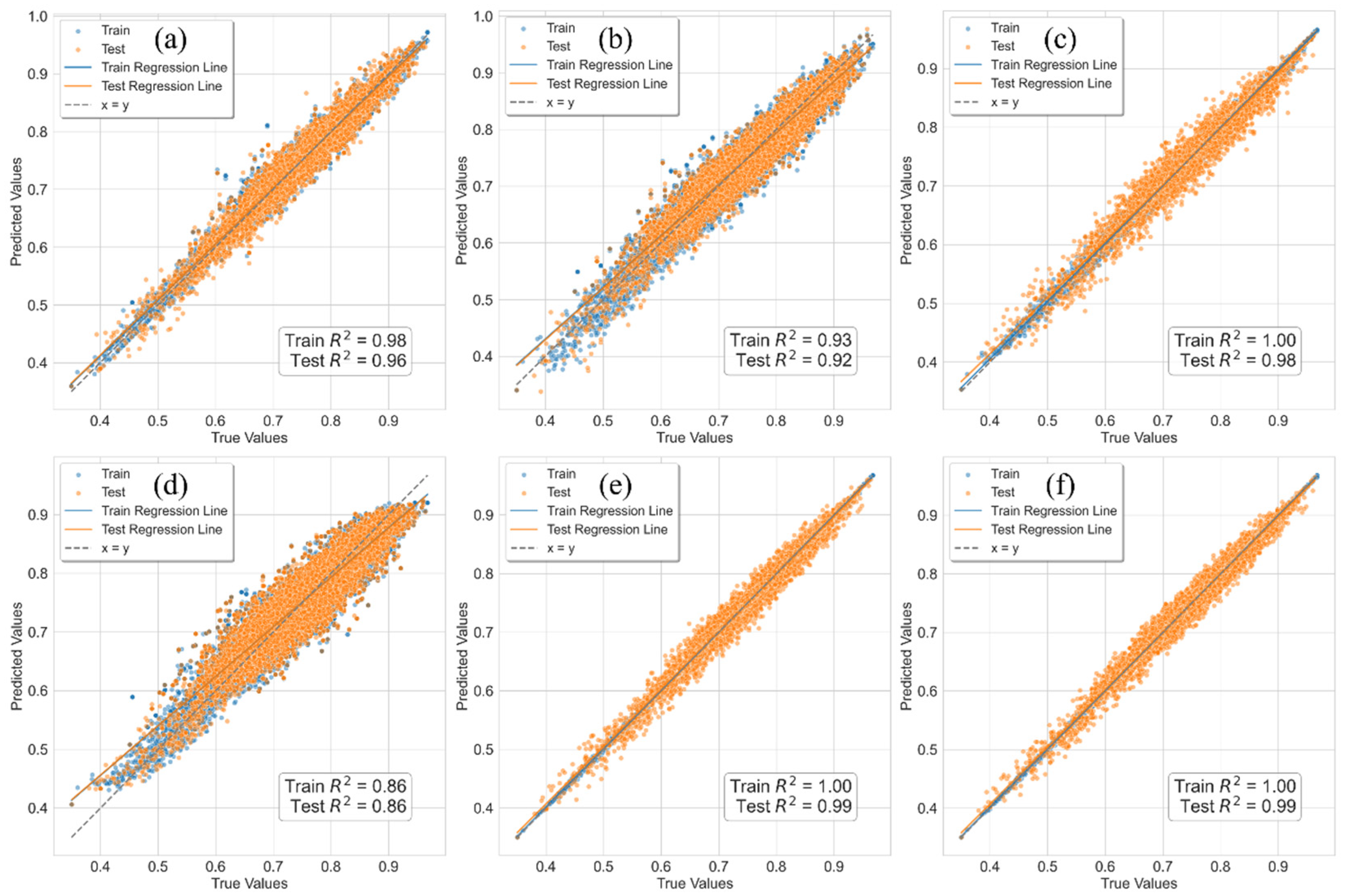Figure 5 shows the estimation accuracy of geometric features by various models. In subplots (c)–(e), when estimating the three geometric features graphite_nodularity, avg_roundness, and avg_ratio, slight overfitting is observed in the RF, XGBoost, and CatBoost models. This indicates that the data distribution does not fully represent the real scenario, and there are a small number of outliers in the training set.